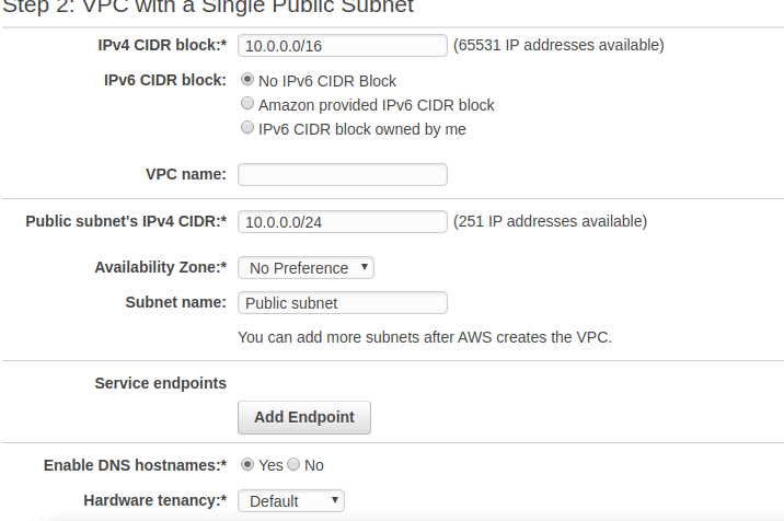 In each Region, AWS will provision a default VPC. This VPC has a /16 IPv4 CIDR address block of 172.31.0.0/16. This provides 65,536 private IPv4 addresses. In addition, there will be a /20 subnet that is created for each Availability Zone in the Region, which provides 4,096 addresses per subnet, with a few addresses reserved for AWS usage. The route table that is associated with the default VPC will have a public route, which in turn is associated with a provisioned internet gateway.