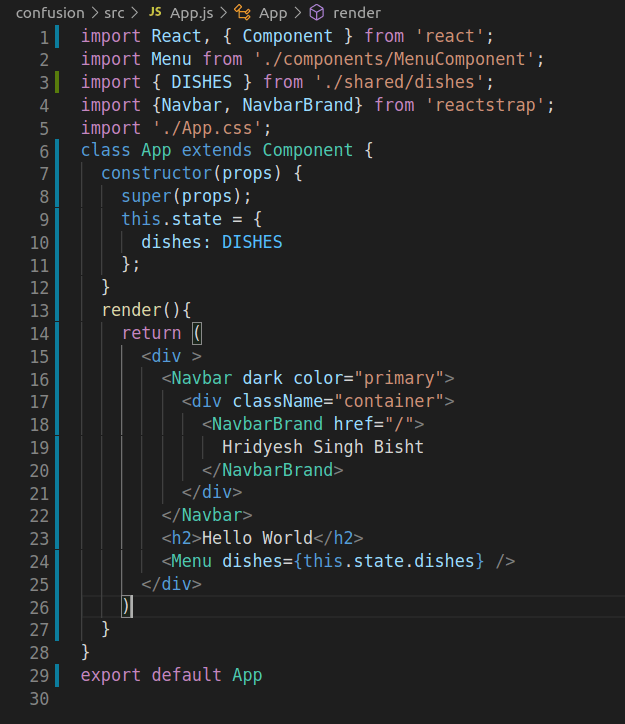 Any component in React, a class component should implement this method called render() which will turn the corresponding view for this component. So, inside this render method, I need to return the view for this component. Also when you create the component, don’t forget to export that component from this file, because we would need to import this component wherever we want to make use of it within our application.