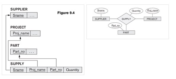 For each n-ary relationship create a relation to represent it. Add a foreign key into each participating entity type. Also add any attributes of the relationship. The primary key of this relation is the combination of all foreign keys into participating entity