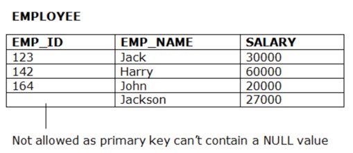 1.Primary Key Constraint: Primary key is to uniquely identify each record in a table. It must have unique values and cannot contain nulls. Thus PRIMARY KEY = NOT NULL+ UNIQUE.