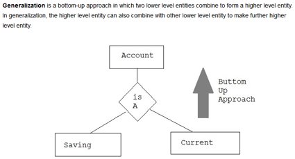 Generalization is the process of extracting common properties from a set of entities and creating a generalized entity from it. It is a bottom-up approach in which two or more entities can be generalized to a higher level entity if they have some attributes in common.