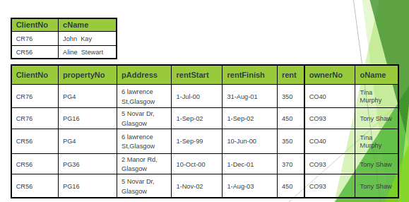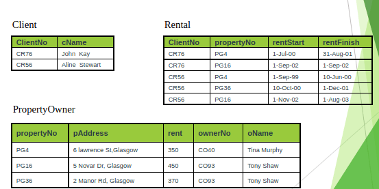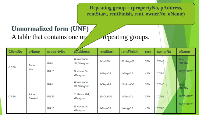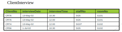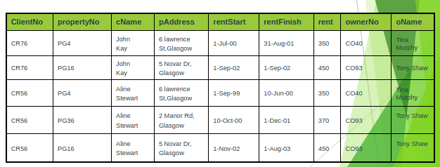 With the second approach, we remove the repeating group (property rented details) by placing the repeating data along with a copy of the original key attribute (clientNo) in a separte relation.