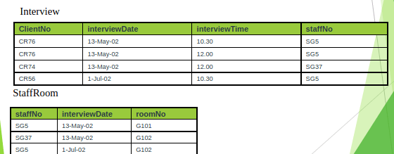 To transform the ClientInterview relation to BCNF, we must remove the violating functional dependency by creating two new relations called Interview and SatffRoom as shown below,