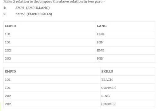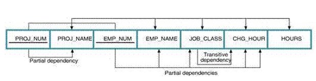 In the above example, Proj_NAME depends on Proj__NUM whereas EMP_NAME, JOB_CLASS and CHG_HOUR is depends on EMP_NUM.