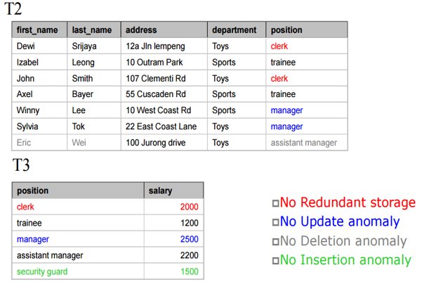 - Both goals reduce the amount of space a database consumes, ensures data is logically stored, and maximize operational efficiency.