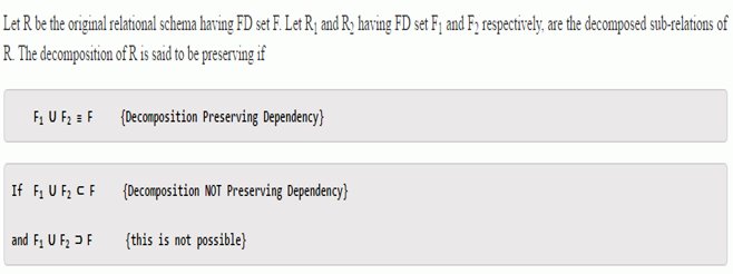 If the original table is decomposed into multiple fragments, then somehow, we suppose to get all original FDs from these fragments. Every dependency in original table must be preserved or say, every dependency must be satisfied by at least one decomposed table.