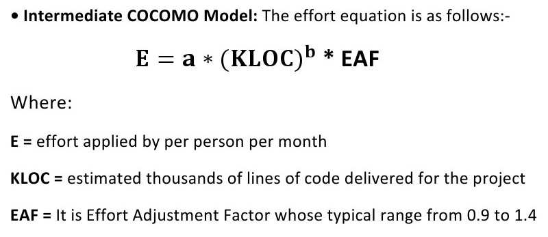 2.Intermediate model: Various other factors are taken into account, know as Cost Drivers for evaluating effort in this model