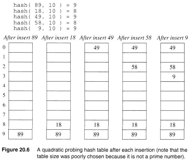 - There is no guarantee of finding an empty slot once the table becomes more than half full if the table size is not prime.
