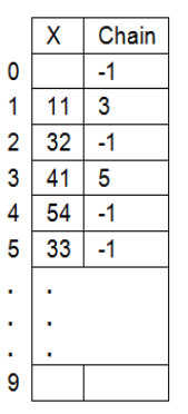 - The hash address of 33 is 3 but it is occupied. So 3 is placed at position 5 and a chain is formed from position 3 to 5 as shown.