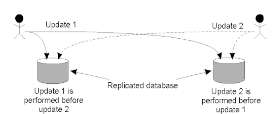 Updating a replicated database and leaving it in an inconsistent state: Update 1 adds 100 euro to an account, Update 2 calculates and adds 1% interest to the same account. Due to network delays, the updates may not happen in the correct order. Whoops!