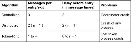 - The “Centralized” algorithm is simple and efficient, but suffers from a single point-of-failure.